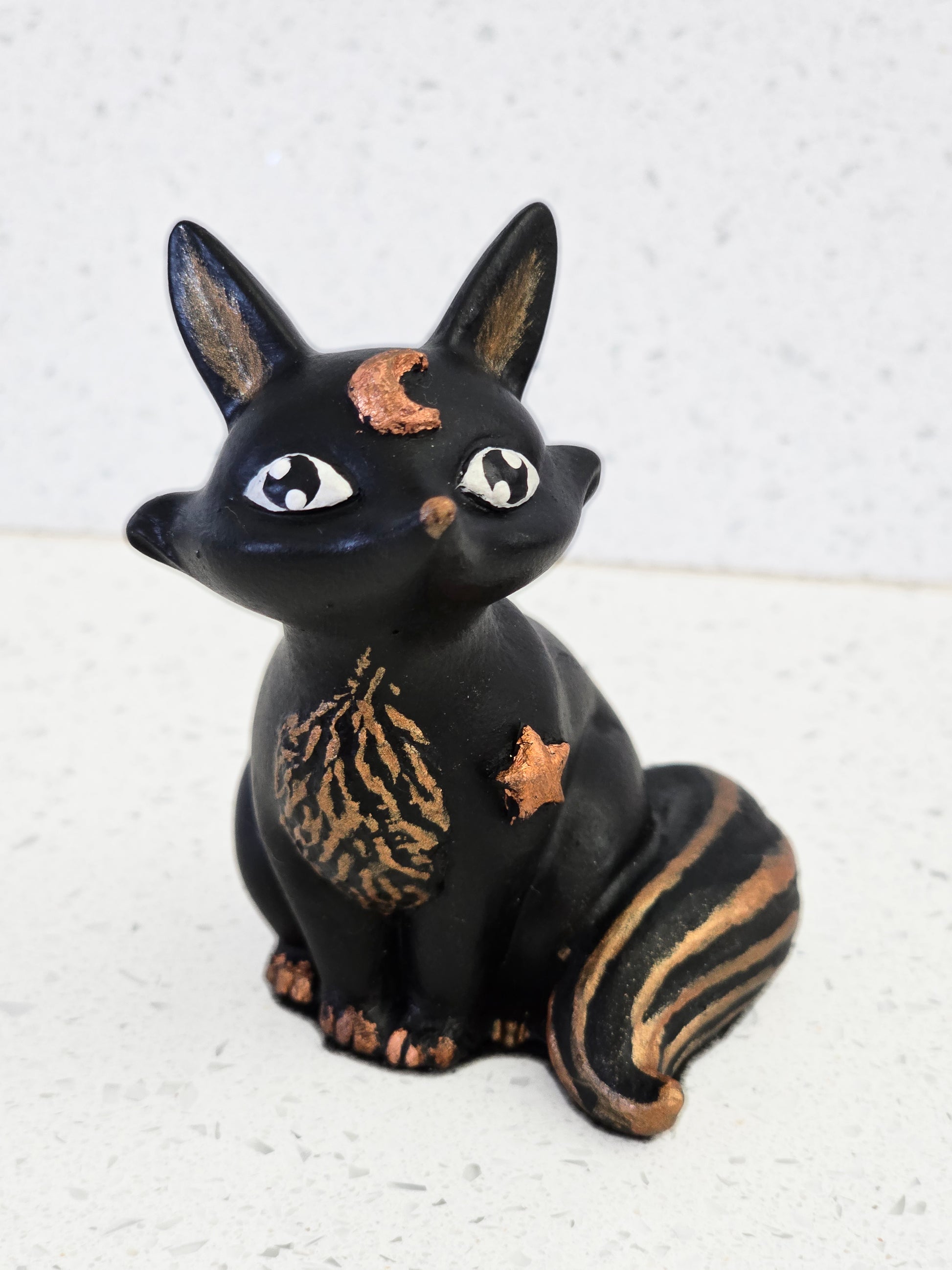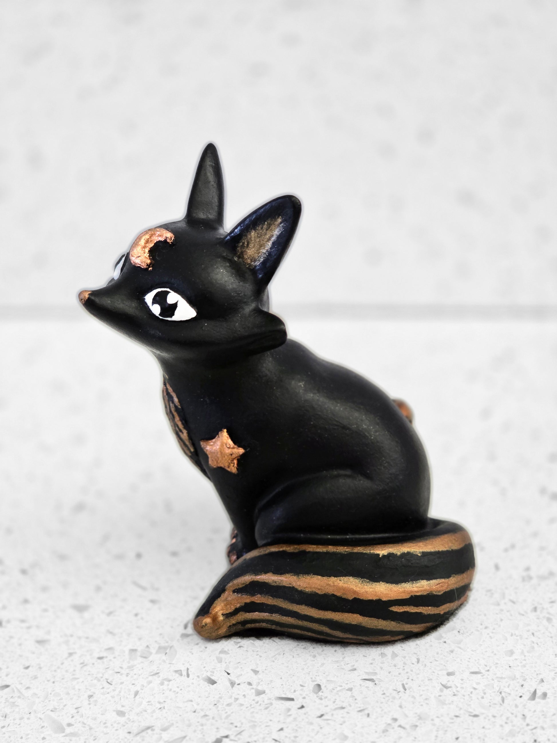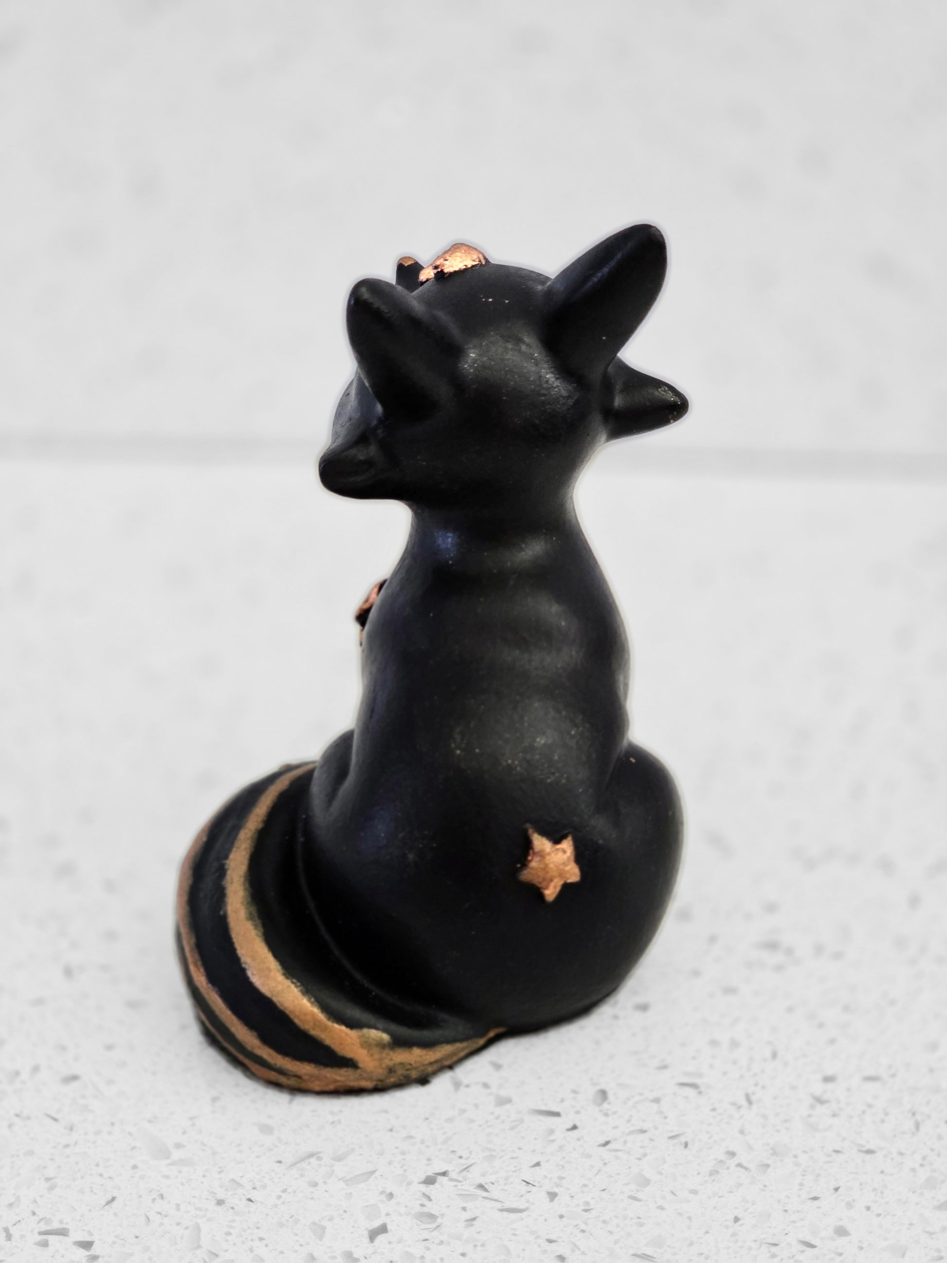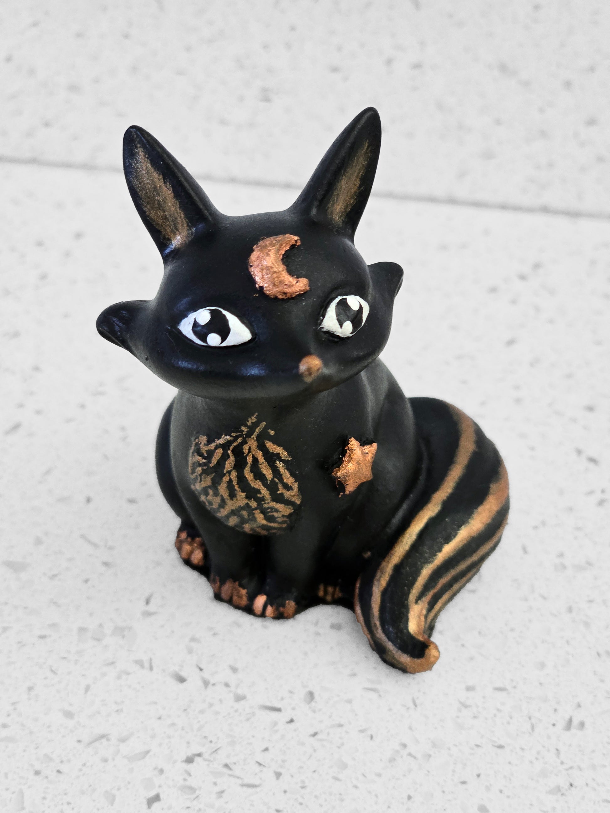 Starbite is your exclusive handmade alt pup, bursting with personality and cosmic charm! This ebony beauty showcases mesmerizing copper-rose gold accents paired with starry and lunar details that echo her celestial sister's vibe.
